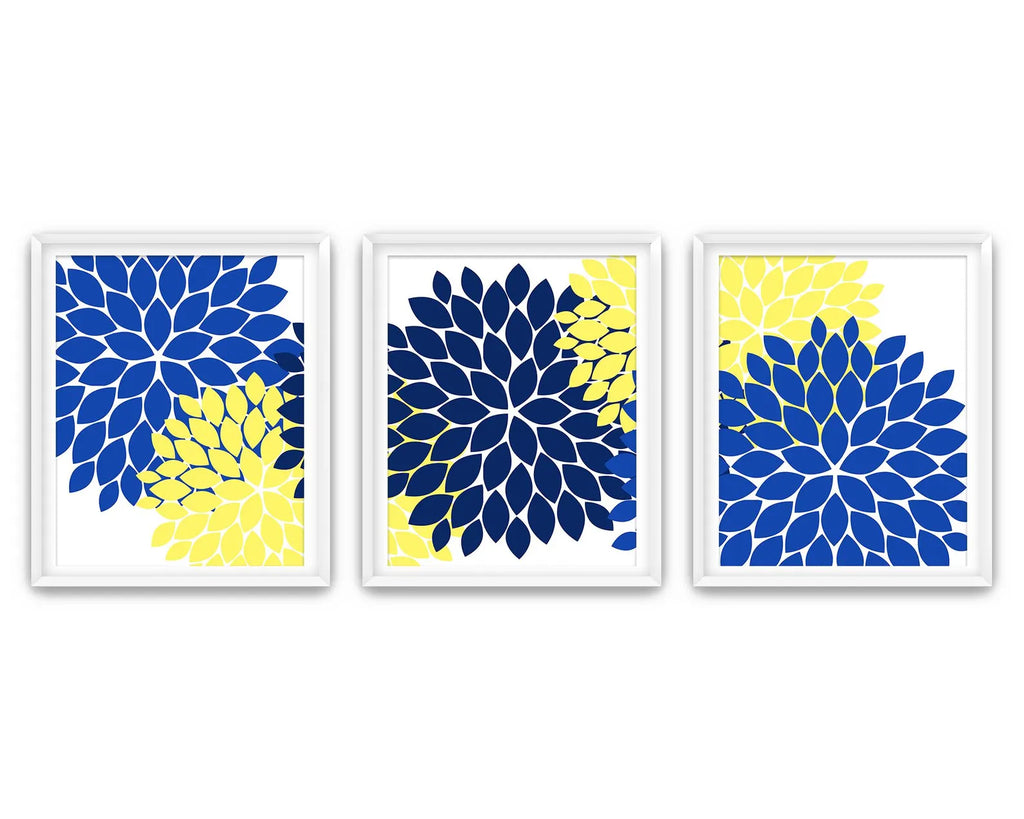 Brighten any room with this modern set of three vertical wall art prints featuring a vibrant floral pattern. The triptych design showcases overlapping dahlia or flower burst patterns in bold navy blue and bright yellow against a crisp white background. This colorful set is perfect as blue bedroom decor, modern bathroom art, or cheerful nursery wall art. Choose your print medium and size options to see pricing for each product - unframed paper prints, framed art prints, or stretched canvas in a variety of sizes.